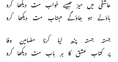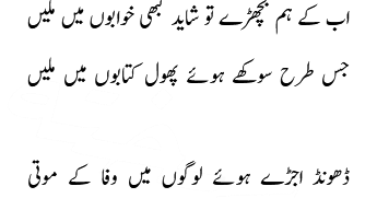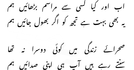 Silsilay tor gaya wo sabhi jatey jatey Warna itnay tou maraasim thay, ke aataya jatay سلسلے توڑ گیا وہ، سبھی جاتے جاتے ورنہ اتنے تو مراسم تھے کہ آتے جاتے Ahmed Faraz
